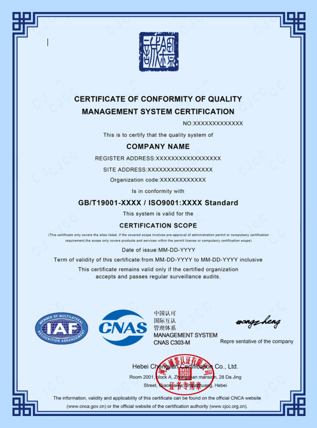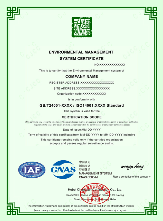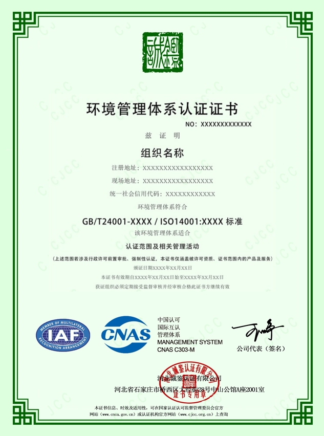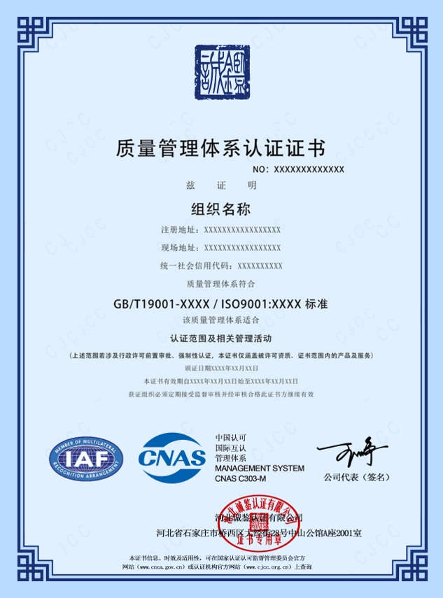 河北誠鑒認證有限公司(簡稱誠鑒認證/CJCC),創(chuàng)立于二零一七年,經(jīng)國家認證認可監(jiān)督管理委員會(CNAS)批準(批準號CNCA-R-2018-412),中國合格評定國家認可委員會(CNAS)認可(注冊號:CNAS C303-M)),是從事質(zhì)量管理體系、環(huán)境管理體系、職業(yè)健康安全管理體系認證,具有獨立法人資格的第三方認證機構。